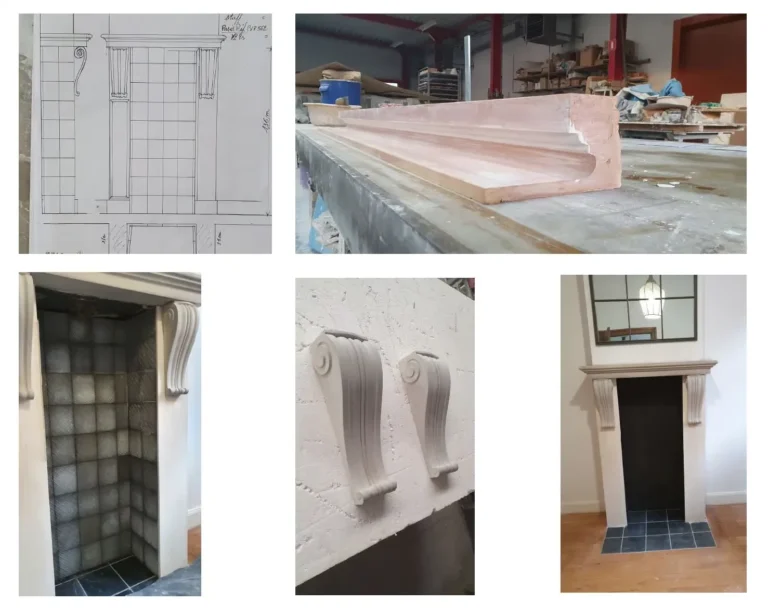 création ; dessins, sculpture en terre de divers ornements destinés à la rénovation de la décoration,